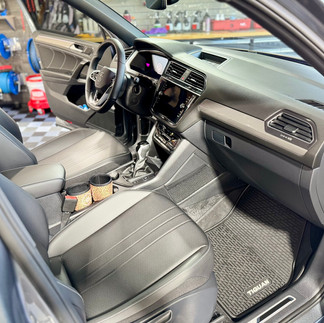 Although brand new, this 2024 VW Tiguan had gone through the dealership’s car wash and was prepped by porters, leaving behind several flaws. We started with a 1-Step paint correction to remove all blemishes, followed by the application of an 8-Year ceramic coating for maximum protection. After curing, we then topped it with a 3-Year ceramic with graphene for an ultra-high gloss finish. The 19” wheels were polished to remove all swirls and imperfections from their glossy black finish, then ceramic coated for added durability. We also coated the tires with a no-sling protectant that will last for several months. Inside, we removed the dealership’s high-gloss interior spray and properly treated the leather seats and all hard surfaces. Now, this Tiguan looks flawless and is fully protected.
